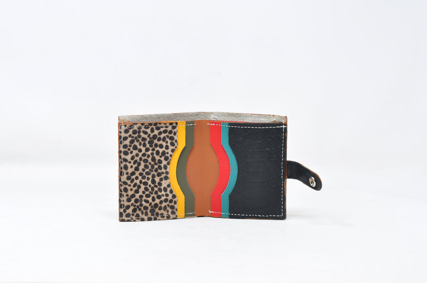 Cartera, tarjetero pequeño de cuero; hecho a mano en Valencia. Piezas y combinaciones únicas, realizadas íntegramente en cuero de tacto suave y blando. Seis compartimentos para tarjetas, compartimento grande para billetes y uno con cremallera para monedas.