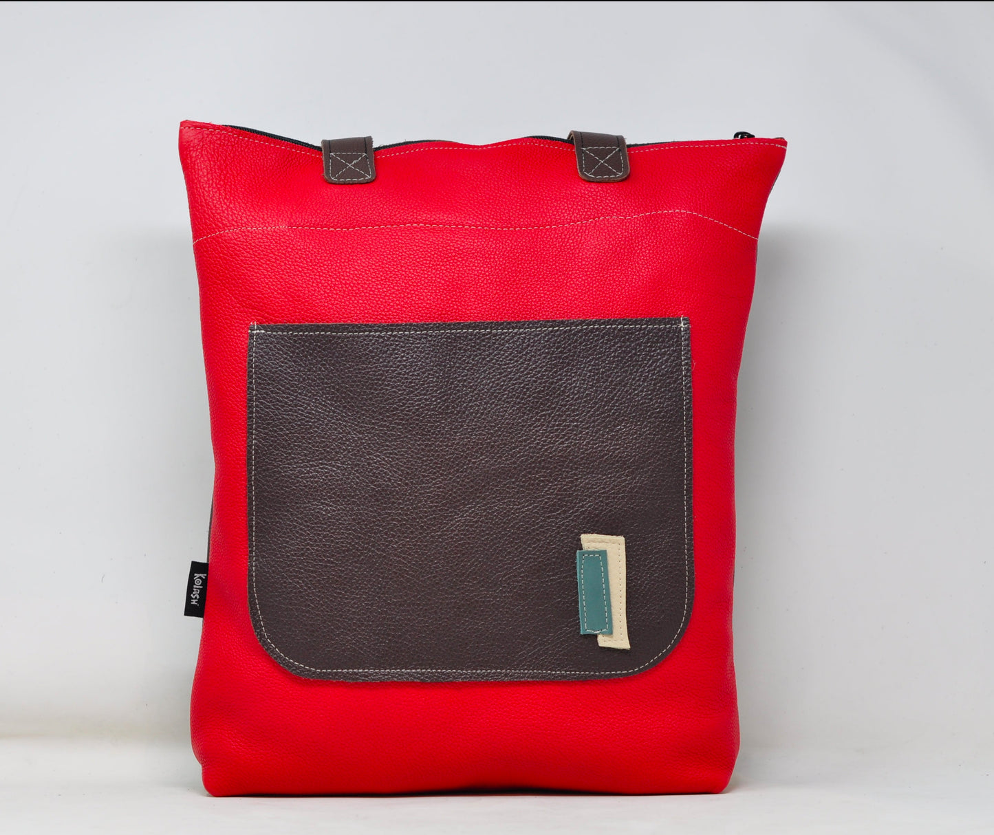 Bolso tote bag de hombro con doble asa, hecho a mano en cuero vacuno 100%, sin forro, diseño único por una cara y bolsillo exterior en la cara posterior. Cierre principal con cremallera y cuenta con un bolsillo interior con cremallera también, apto para ordeandores hasta 15". Esta pieza esta hecha en un cuero de tacto suave y balndo muy agradable, marrón oscuro por una cara y rojo vivo por la otra.