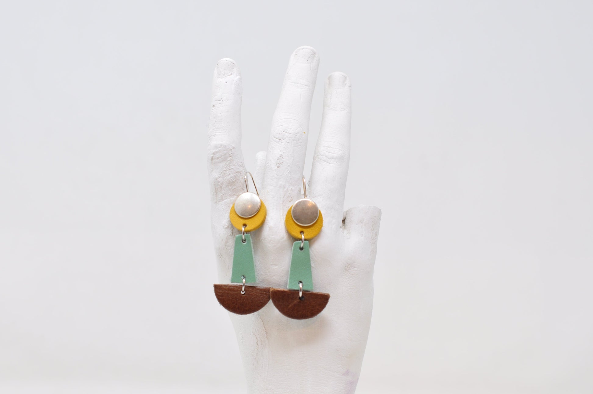 Pendientes largos hechos a mano en cuero y enganches de plata 925 con cierre detrás, color mostaza, verde agua y marrón.
