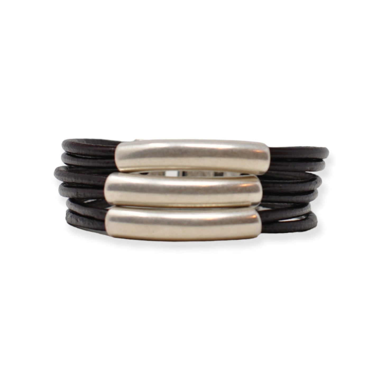 Pulsera de cuero y zamak bañada en plata hecha a mano, con cierre doble de enganche e imán.