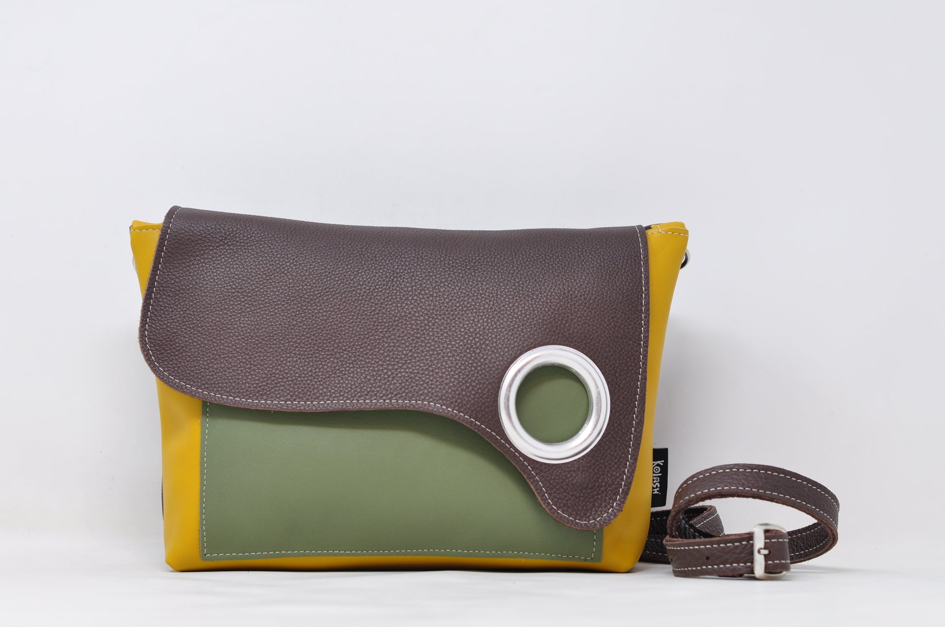 Bolso bandolera, hecho a mano en cuero vacuno 100 %, sin forro, cierre principal con cremallera y solapa con cierre de imán; cuenta con un bolsillo interior de piel con cremallera y un bolsillo exterior. Utópico tiene un tamaño mediano, ideal para todos los días. Cómo todos nuestros bolsos es una pieza única. Trasera en cuero color marrón oscuro.